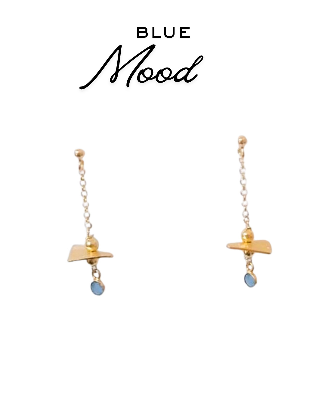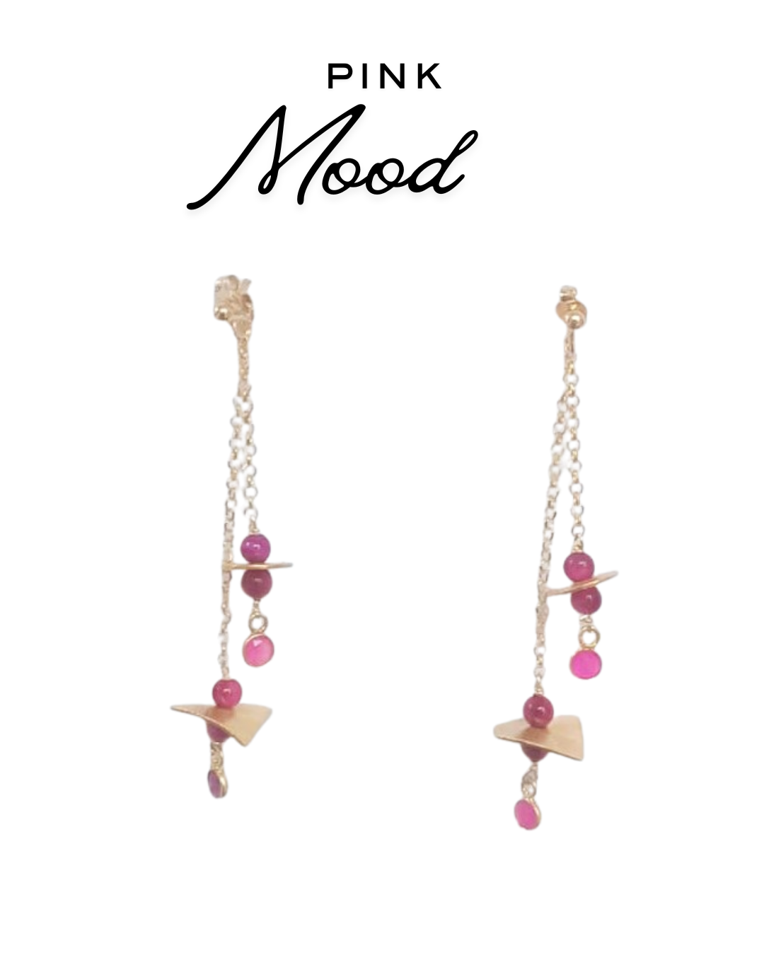 Orecchini pendenti realizzati a mano in argento 925 con bagno in oro, impreziositi da pietre naturali selezionate con cura. Il design minimalista e geometrico combina delicate catene dorate con elementi artistici e pietre colorate – disponibili in fucsia, giallo, verde, rosso e viola – per esprimere ogni sfumatura del tuo stile.